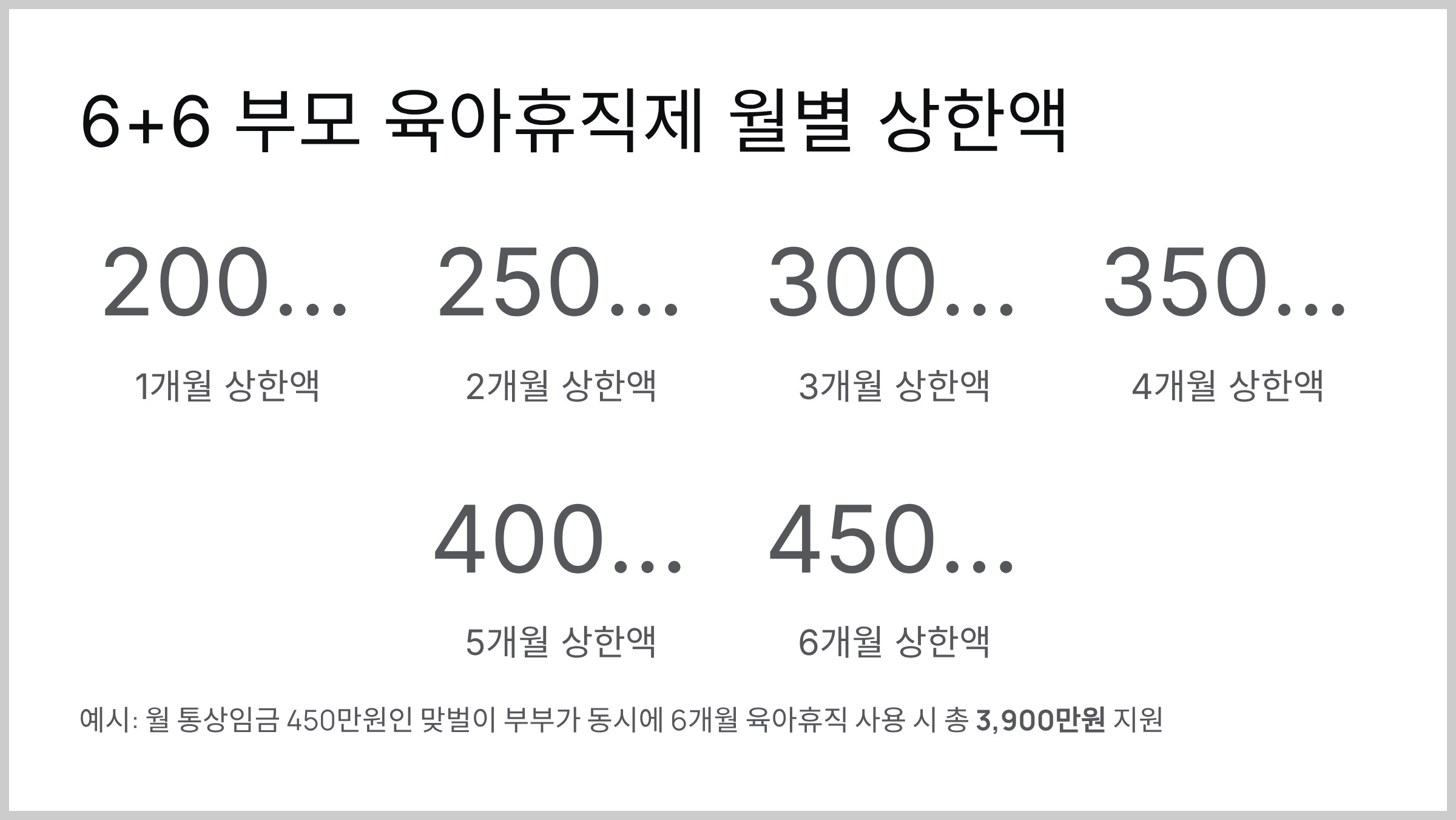 월 통상임금이 450만 원인 맞벌이 부부가 동시에 6개월 육아휴직을 사용하면, 총 3,900만 원(월 200만~450만 원씩)을 받을 수 있습니다. 이는 기존 3+3 제도보다 지원 기간과 금액이 대폭 확대된 것입니다.