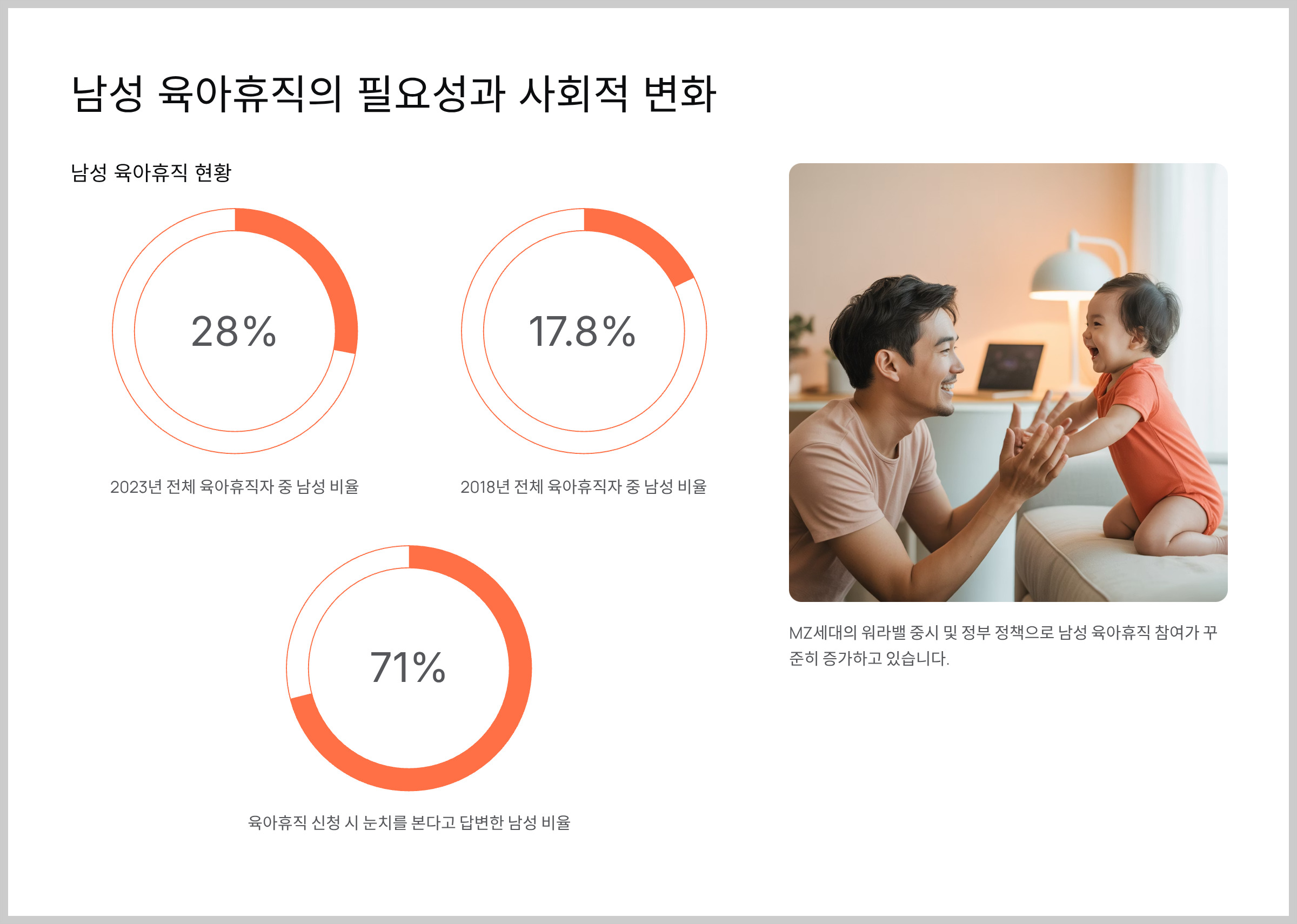 2023년 기준, 전체 육아휴직자 중 남성 비율은 28%로, 2018년(17.8%) 대비 크게 증가했습니다. 이는 워라밸을 중시하는 MZ세대의 가치관 변화와 정부의 적극적인 육아휴직 장려 정책 덕분입니다. 하지만 여전히 71%의 남성이 육아휴직 신청 시 눈치를 보거나 신청이 어렵다고 답변하며, 경제적 부담(소득대체율 46.7%)도 주요 걸림돌로 작용합니다.