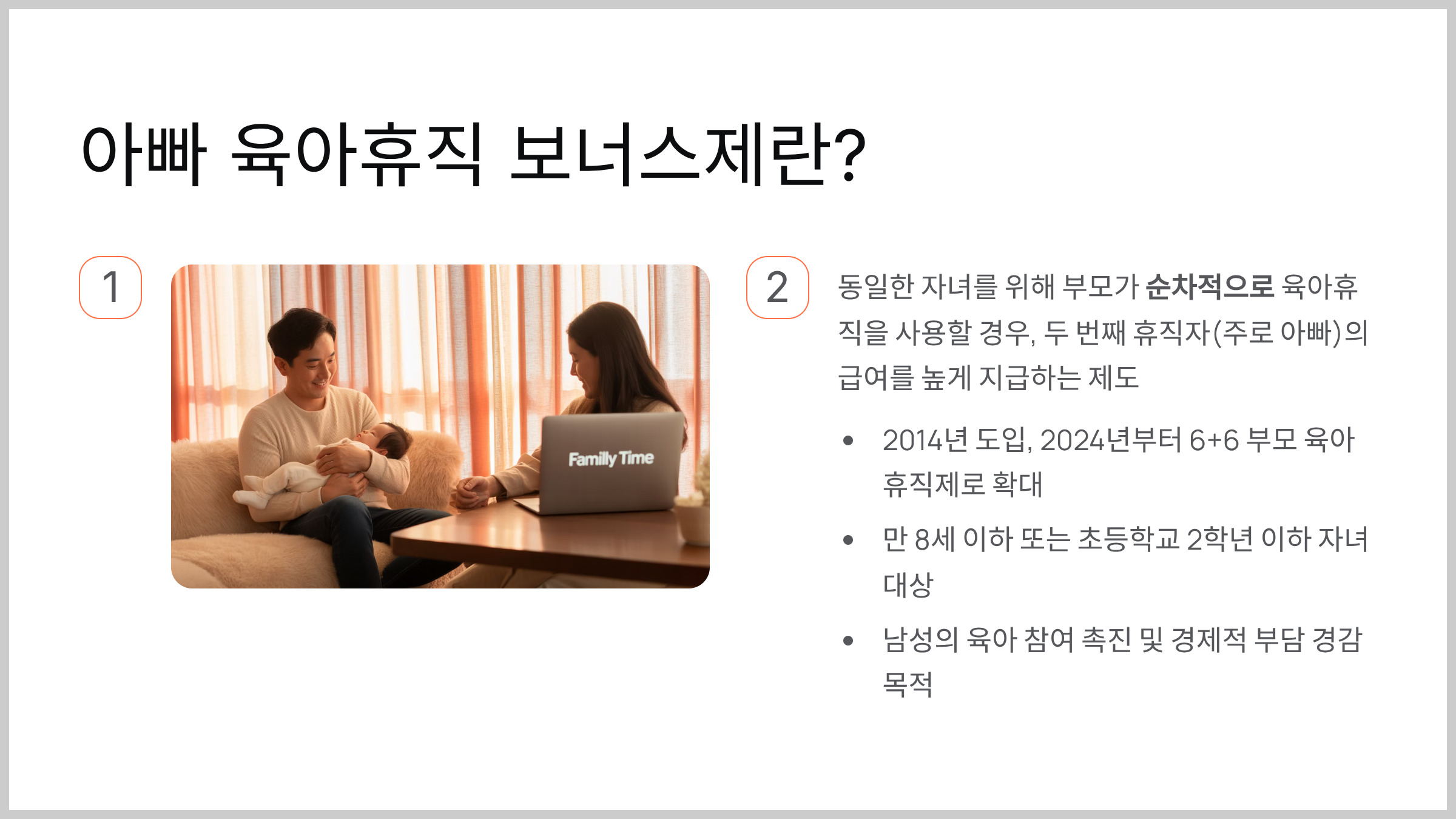 - 목적: 남성의 육아 참여를 촉진하고, 경제적 부담을 줄여 일-가정 양립 지원.