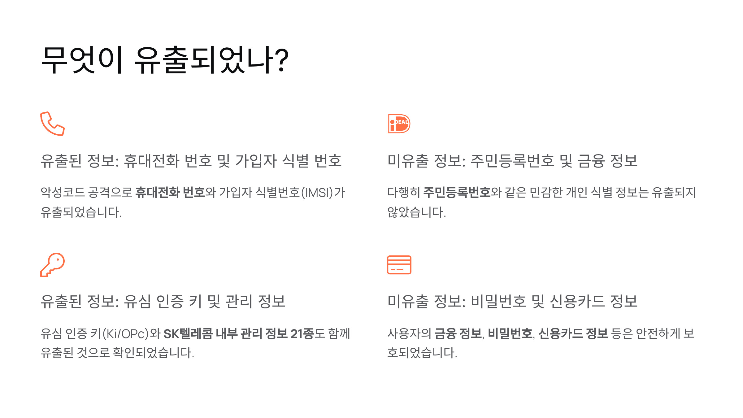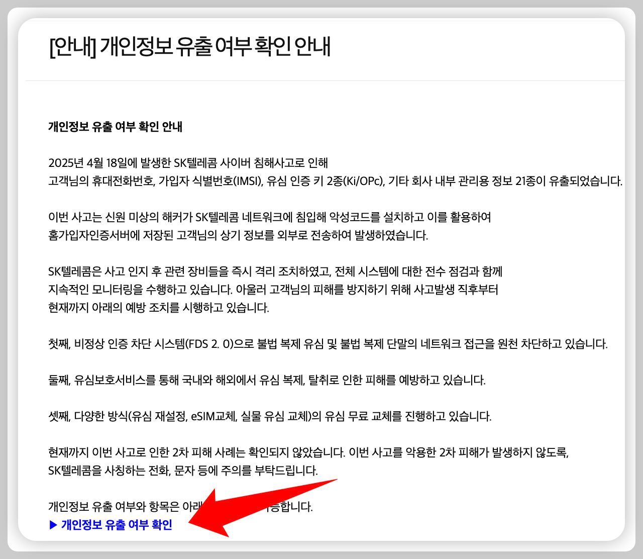 참고: SK텔레콤은 유출 고객에게 개별 문자로 안내를 발송 중이며, 디지털 취약계층을 위해 고객센터에서 직접 전화 안내를 제공합니다.